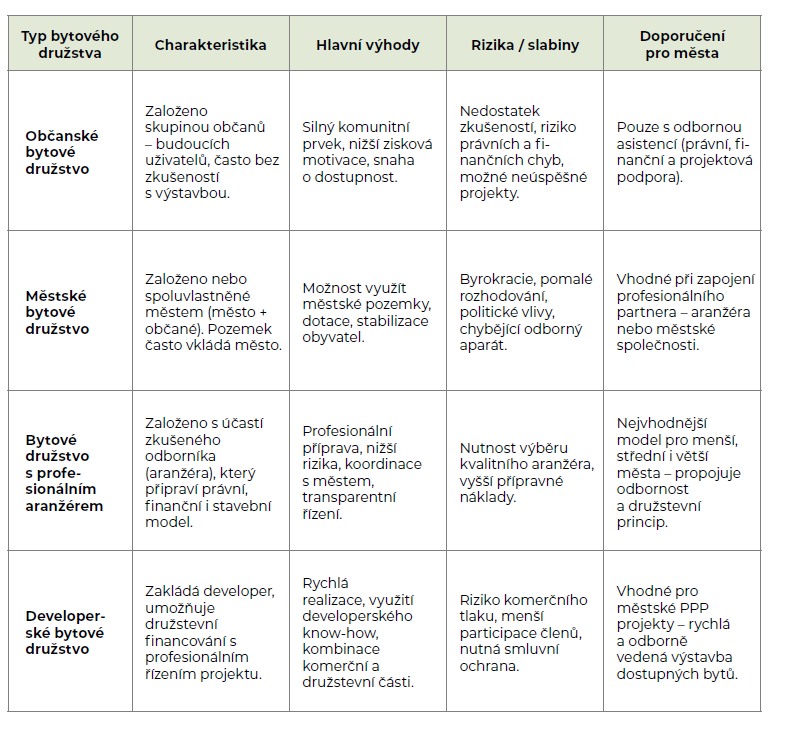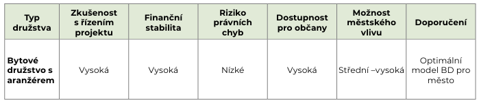 Bytové družstvo založené nebo spoluvlastněné městem (město + občané). Město využívá vlastní pozemky, odborné odbory i finanční zázemí. Řídí přípravu, výstavbu i následnou správu družstva. Model stojí na silné roli samosprávy a dlouhodobé bytové strategii.
